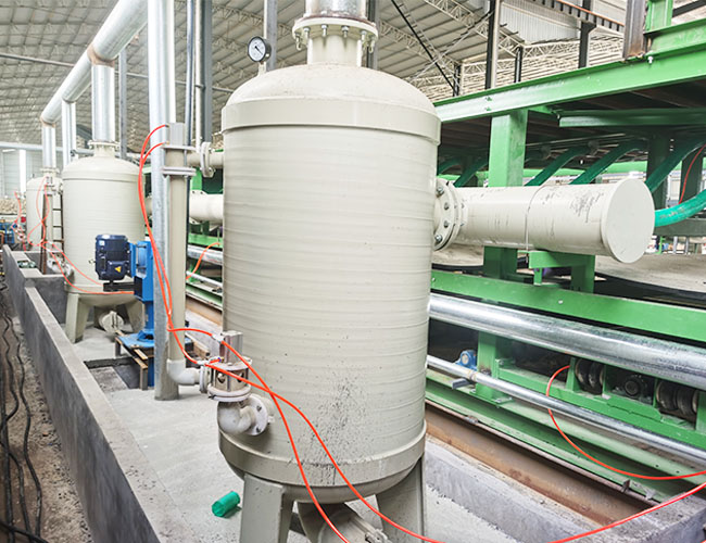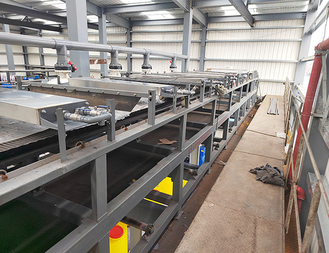 真空帶式過(guò)濾機(jī)以濾布為過(guò)濾介質(zhì),采用整體的環(huán)形橡膠帶作為真空室,環(huán)形橡膠帶由傳動(dòng)裝置傳動(dòng)連續(xù)運(yùn)行,濾布鋪敷在膠帶上與之同步運(yùn)行,膠帶與真空滑臺(tái)接觸(真空室與橡膠帶間裝有環(huán)形摩擦帶并通入水形成水密封),料漿由布料器均勻地分布在濾布上。當(dāng)真空室接通真空系統(tǒng)時(shí),在橡膠帶上形成真空抽濾區(qū),濾液穿過(guò)濾布經(jīng)橡膠帶上的橫溝槽匯總并由中心孔進(jìn)入真空室,固體顆料被截留在濾布上形成濾餅,隨著橡膠帶的移動(dòng),已形成的濾餅受壓力差影響逐步被脫干,最后濾布與膠帶分開(kāi),在卸料輥處將濾餅卸出,進(jìn)入真空室的液體經(jīng)氣水分離罐分離排出。卸除濾餅后濾布經(jīng)清洗后獲得再生,再經(jīng)過(guò)一組支撐輥和糾偏裝置重新進(jìn)入過(guò)濾區(qū),開(kāi)始進(jìn)入新一過(guò)濾周期。真空帶式過(guò)濾機(jī)實(shí)現(xiàn)了真正意義上的連續(xù)運(yùn)行、連續(xù)過(guò)濾,物料從進(jìn)料、脫水、卸渣到濾布清洗,可以不間斷的連續(xù)進(jìn)行。